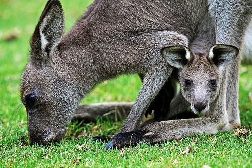 Társas élete: családközösségek A szürke óriáskenguruk erős hátsó lábaikon ugrálnak, és ezt nagy sebességgel teszik. A nőstények egyszerre csak egy kölyköt hoznak a világra. A kengurukölyök azonnal bemászik anyja erszényébe, és két hónapig nem bújik elő. Amíg el nem éri a 10 vagy 11 hónapos kort, a rémült fiatal kenguru, másnevén erszényes, gyorsan lebukik anyja biztonságos erszényébe. Ahogy nő, gyakran lehet látni, hogy fejét és lábát kilógatja az erszényből.